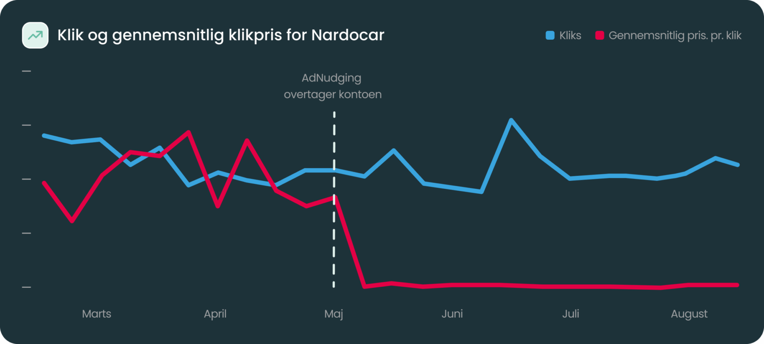 I første omgang var alt sat op internt hos Nardocar med Googles egne automatiserede budstrategier. Det fungerede fint i begyndelsen: de fik meget trafik til lave klikpriser, og der var ro i maven.